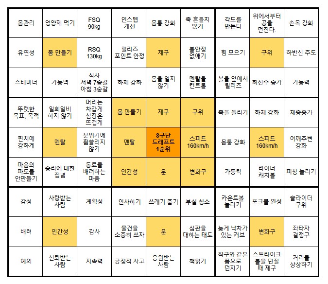 다음은 일본의 야구선수 오타니 쇼헤이가 실제로 활용한 만다라트입니다. 그는 이 구조를 통해 자신의 목표를 세우고, 단계적으로 실천하면서 현재 최고의 선수가 될 수 있었습니다.